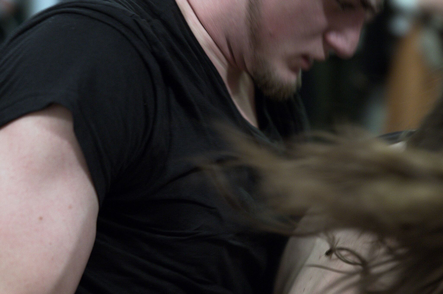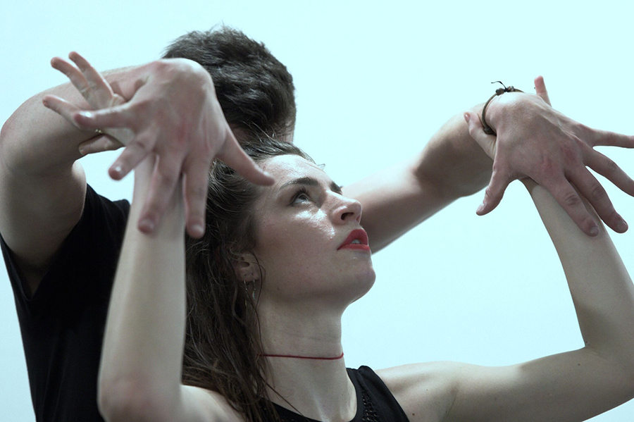 [EN] Solitude(s) is a choreographed performance dealing with the ambiguity of human relationships. The three performers introduce strange and unexpected gestures into familiar movements, morphing tenderness into rage and vice versa. These scenes deploy a large array of facial morphologies and expressions, stretching from smile to rictus, from fear to compassion, from desire to remorse. The performers’ bodies become living sculptures in confrontation with reality, denouncing our collective fascination with violence. Moreover, bodies become instruments of space exploration: in a sparsely designed area, they position, deploy and close themselves. The repetitive, minimalist music by Todd Lent was created concurrently with the choreography.