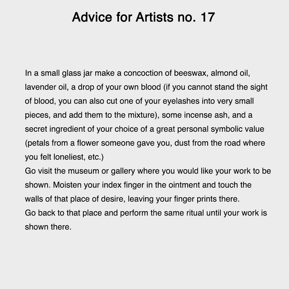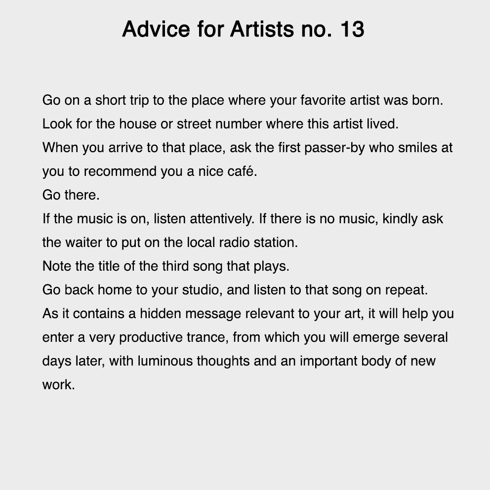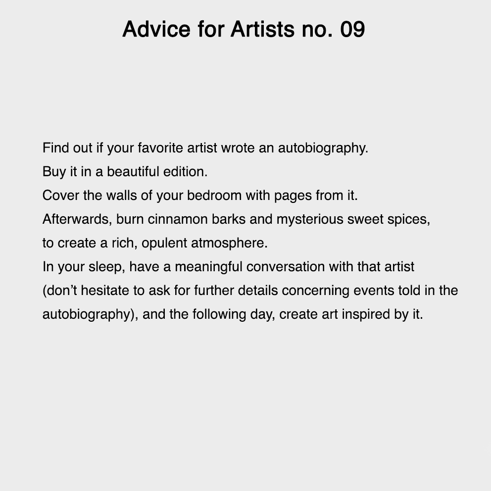 [FR] Advice for Artists (Conseils pour artistes) est une série de courts textes narratifs mêlant instructions pour performances et injonctions poétiques. Ce projet prend pour objet les dimensions peu maîtrisables des trajectoires d’artistes et d’œuvres, et concernent aussi bien le processus créatif que le succès d’une œuvre par sa reconnaissance. La pensée magique trouve ici un terrain particulièrement fructueux puisqu’il s’agit là d’espaces d’incertitudes qu’elle vise à conjurer et à maîtriser. Formellement, le projet se place dans la lignée des recherches de Yoko Ono (dans Grapefruit) et de Christian Boltanski (dans Do It). En tant que notes à style imagé à fonction ouverte, les Conseils sont à la fois des poèmes, tes tableaux textuels, et des indications de performances.