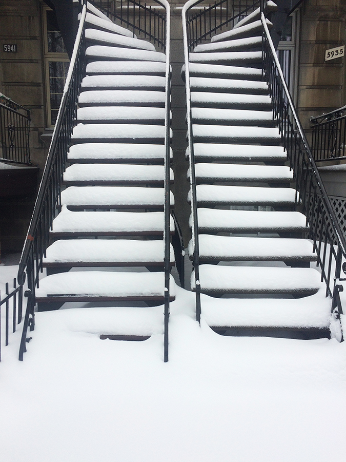 [FR] Sculptures dans la ville est une série de 60 photographies digitales de constructions urbaines trouvées dans la ville de Montreal pendant l’hiver 2018/2019. Inspirées par l’esthétique du Realraum et ayant comme origine le concept d’objet trouvé, ces images ne s’intéressent pas à l’autobiographie personnelle ou à l’immédiateté émotionnelle, mais évoquent plutôt des sentiments d’étrangeté et d’errance. Ces fragments de paysages urbains sont une méditation sur l’opposition rigide entre nature/culture mise prégnante dans la société occidentale, ainsi que sur la corporealité de la sculpture contemporaine, où l’ombre d’un arbre en pleine nuit, des feuilles mortes sur un escalier, ou des pas dans la neige, peuvent se présenter comme objets d’art. Ce projet a reçu le support de la Fondation Culturelle Timpul.